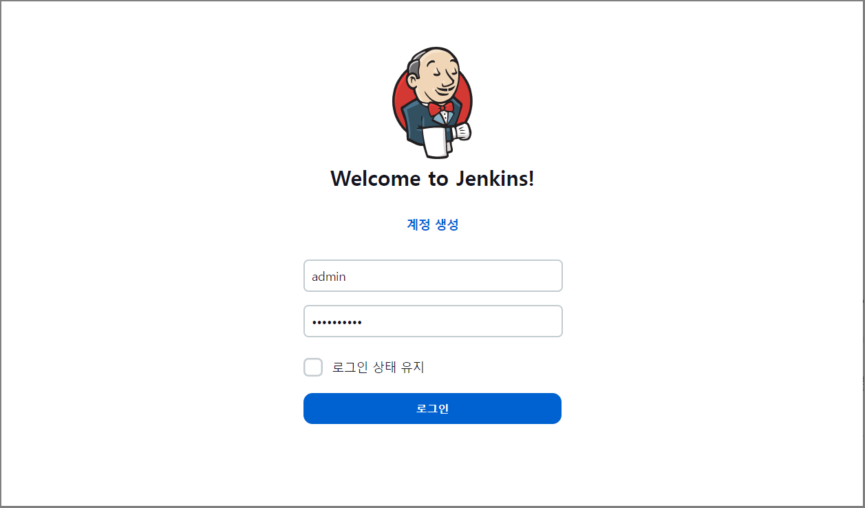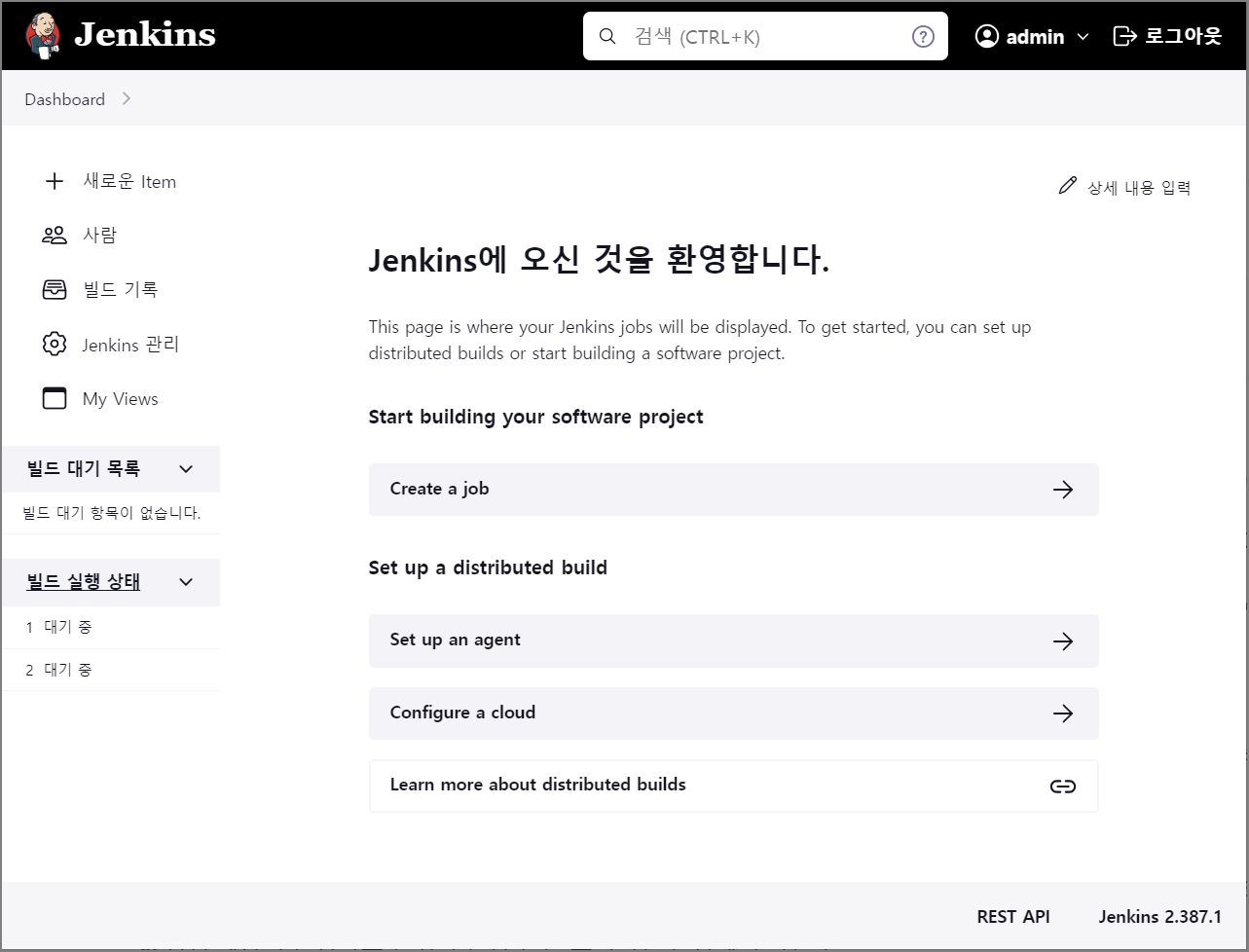 Jenkins 관리 페이지 접속 시 아래와 같이 사용자 이름 및 암호를 입력할 필요 없이 바로 관리자 페이지로 접속됩니다.