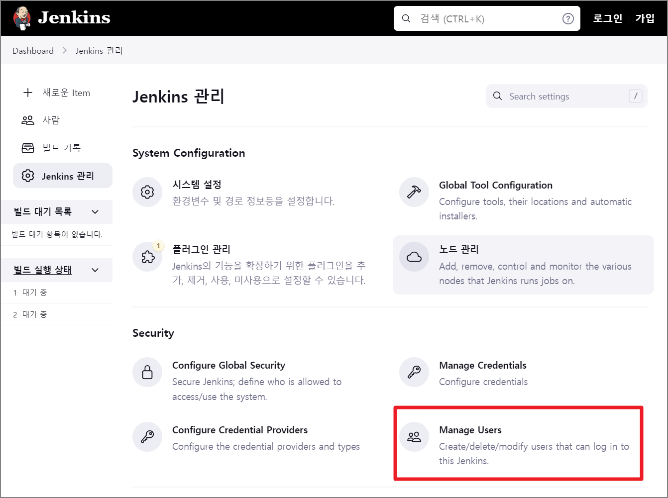 설정 저장이 완료되면 기존에 없었던 Security -> Manage Users 메뉴가 생성되며 해당 메뉴를 접속합니다.