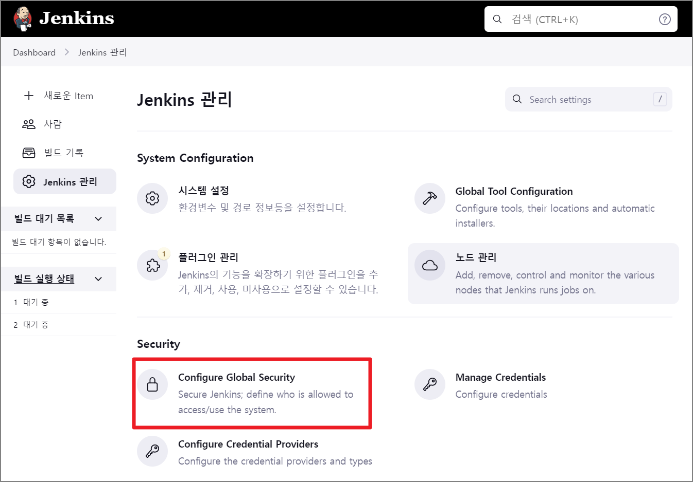패스워드 복구를 위해 Jenkins -> Security -> Configure Global Securiy 메뉴를 접속합니다.
