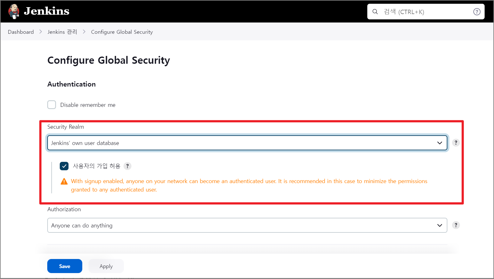 기존에 None 으로 설정되어 있었던 Security Realm 설정을 Jenkins' own user database 로 변경하고 사용자의 가입 허용을 체크하고 Save 버튼을 눌러 저장합니다.