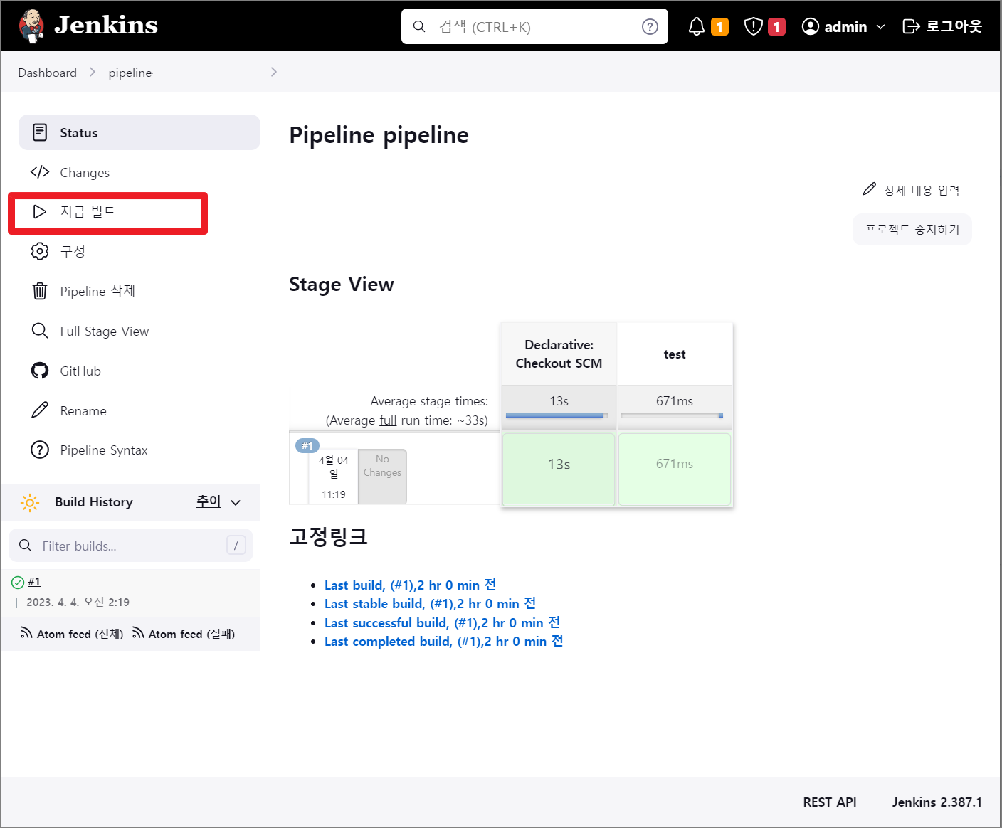Jenkins Pipeline 화면에서 지금 빌드 버튼을 클릭하여 빌드를 테스트합니다.