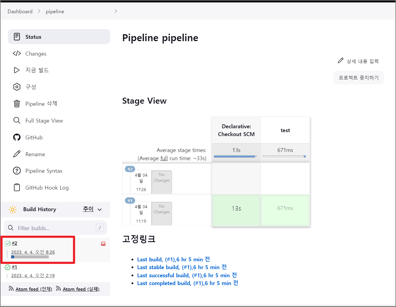 지금까지 Jenkins에서 GitHub 프로젝트와의 연동과 WebHook을 통한 Pipeline 자동화 구축 작업을 완료하였습니다...! 끝...!