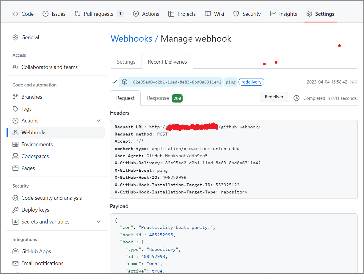 Webhook 연결의 상세로그를 확인하려면 Webhook 선택 후 Recent Deliveries를 선택하면 Ping Check에 대한 상세로그를 확인할 수 있습니다.