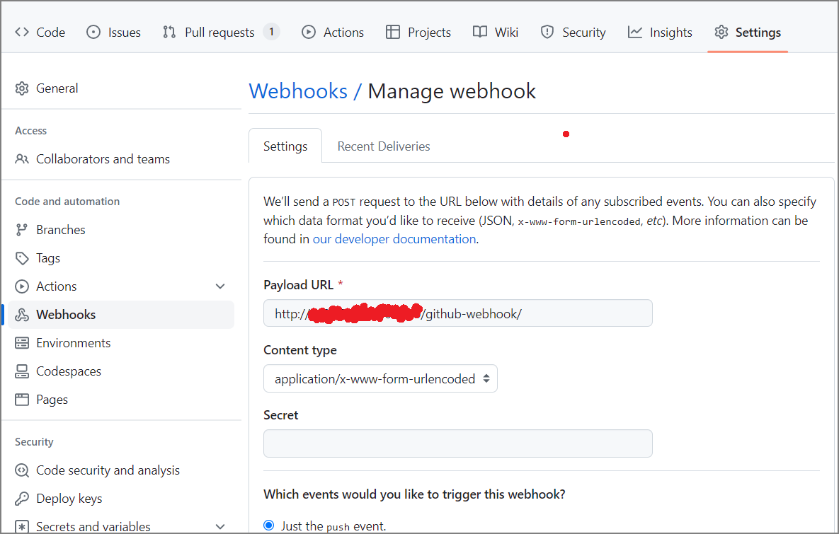 Playload URL 주소는 "http://{{Jenkins 서버 주소}}/github-webhook/" 값으로 설정합니다.