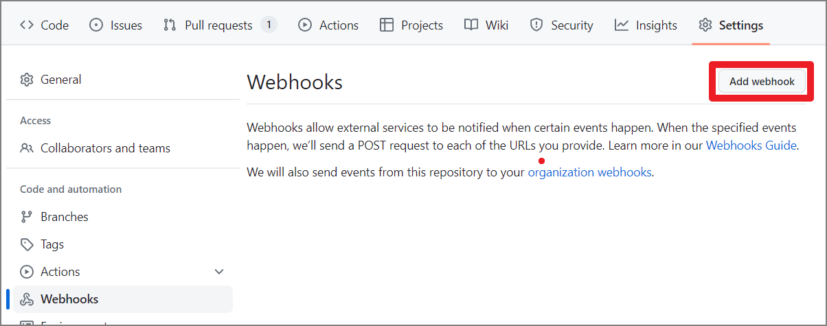 GitHub에서는 설정하고자하는 프로젝트의 Webhooks 설정을 추가합니다.