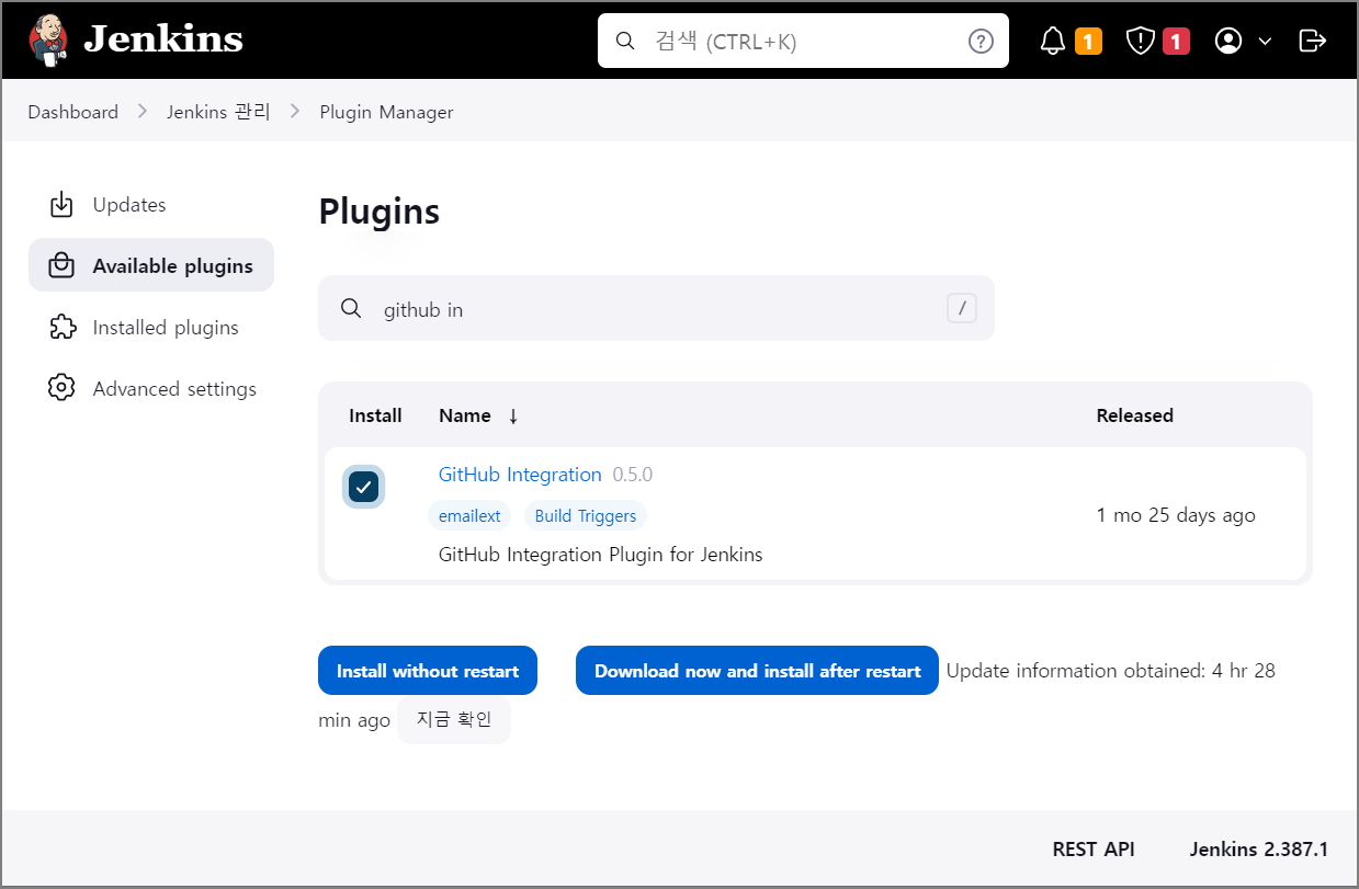 Jenkins에서 GitHub WebHook 연동을 위해 GitHub Integration 플러그인을 설치합니다.
