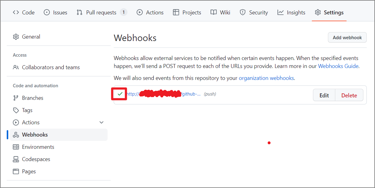 설정 완료 후 정상적으로 Webhook 연결이 완료되면 Webhooks 설정에 정상(체크) 표시가 활성화됩니다.