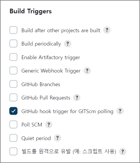 설정하고자하는 프로젝트 Pipeline 상세 설정의 Build Triggers 설정 중 GitHub hook trigger for GITScm polling 항목을 체크 후 저장합니다. 해당 설정은 GitHub으로부터 WebHook 이벤트를 받고자하는 설정입니다.