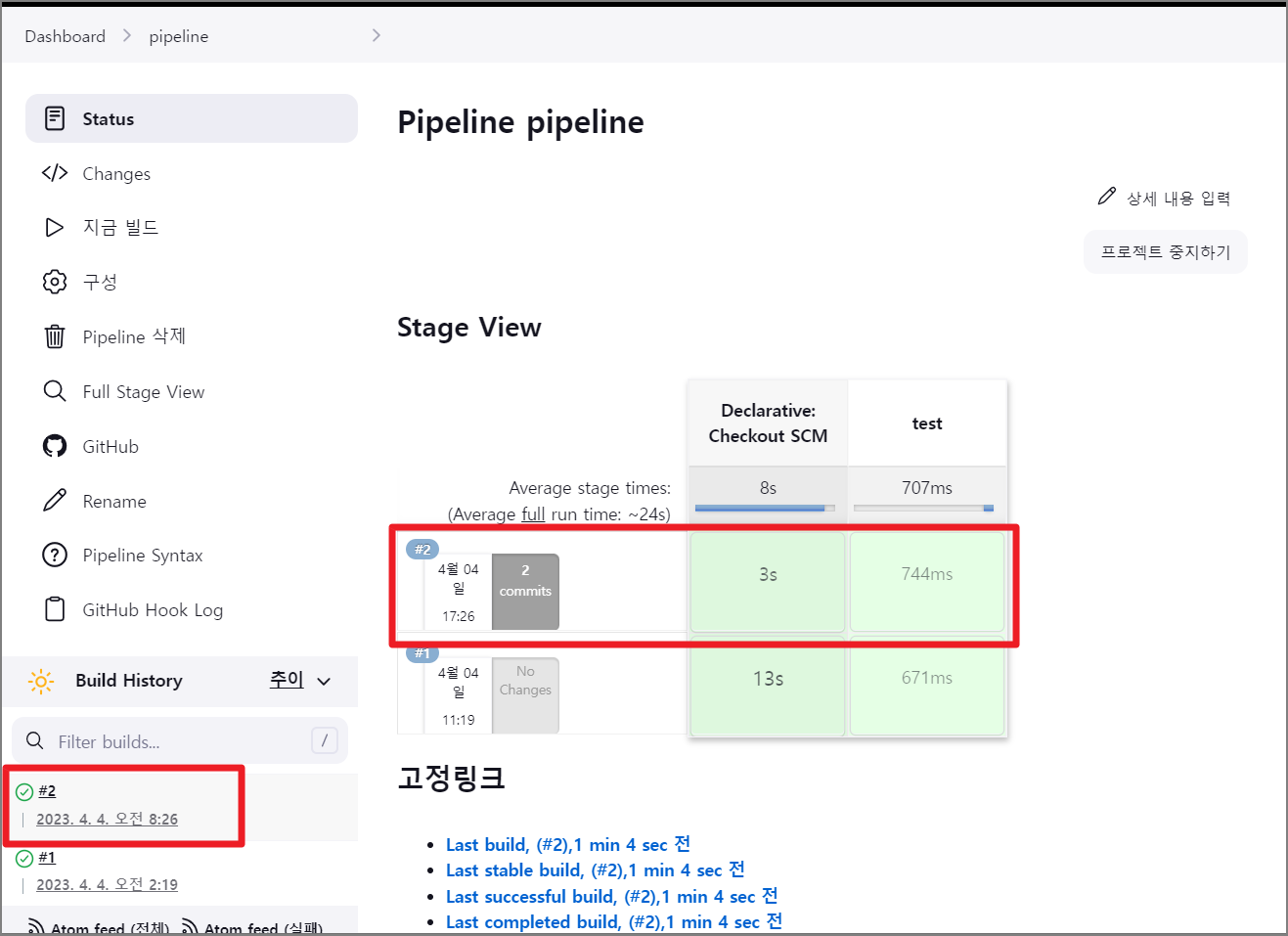 Pipeline 빌드가 완료되면 아래와 같이 빌드 상태를 확인할 수 있습니다. 별도로 지금 빌드 버튼을 클릭하지 않고도 자동으로 빌드가 실행되고 성공했음을 확인할 수 있습니다.