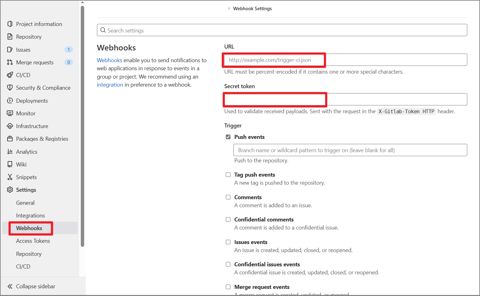 이제 GitLab 프로젝트에서 WebHook 설정을 추가해봅시다.