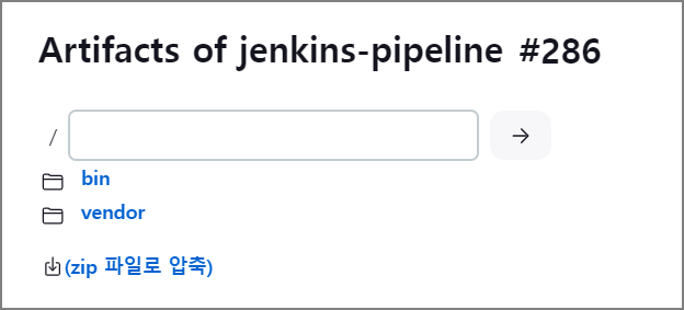 빌드 완료 후 해당하는 빌드의 Workspace를 확인하면 아래와 같이 vendor 디렉토리와 bin 디렉토리의 파일을 확인하실 수 잇습니다.