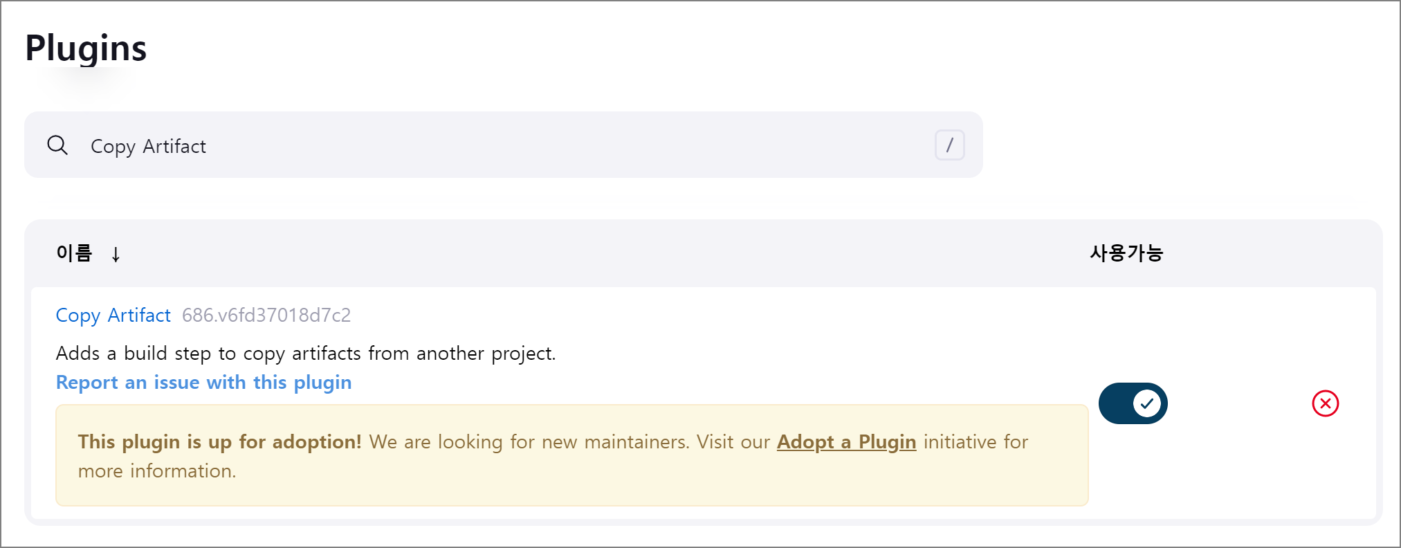 Artifact 기능을 사용하기 위해 Copy Artifact 플러그인을 설치해줍니다. 플러그인은 "Jenkins 관리 -> 플러그인 관리" 메뉴에서 설치가 가능합니다.