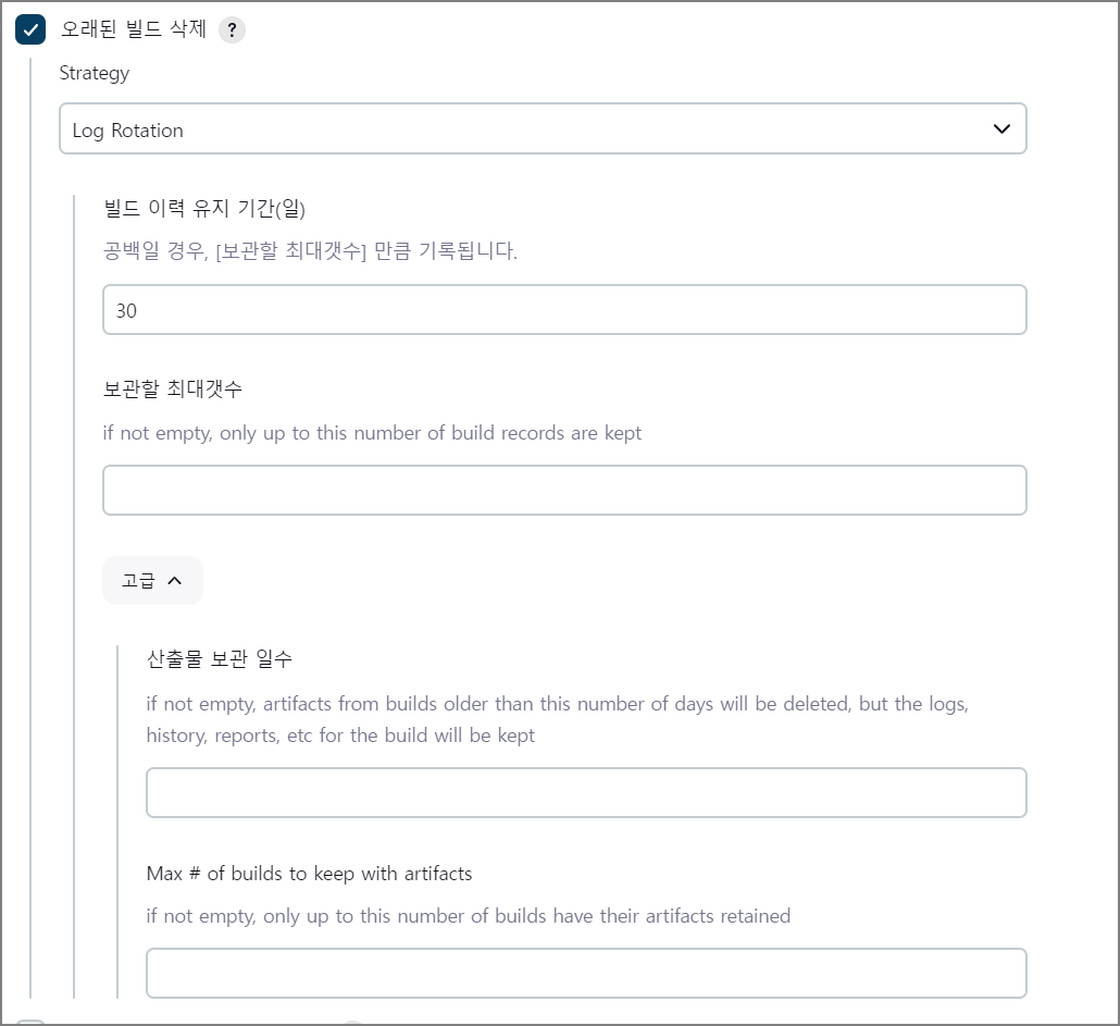 - artifactDaysToKeepStr : 빌드 아티팩트를 유지할 일수