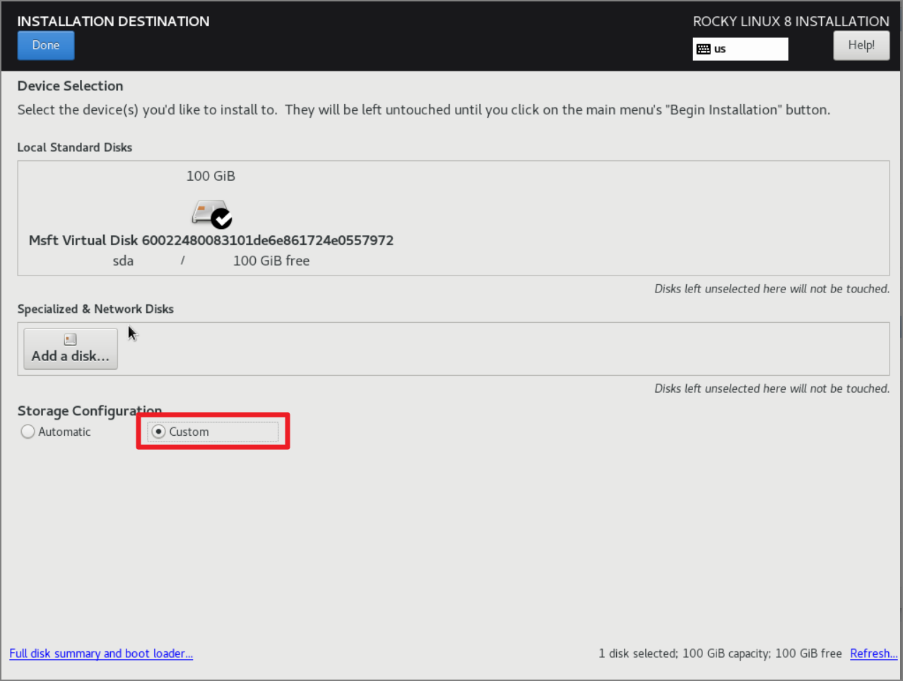세 번째로는 INSTALLATION DESTINATION 설정입니다. 저는 수동으로 디스크를 설정하기위해 Custom을 선택하였습니다. 자동으로 설정되는 Automatic을 설정하셔도 상관 없습니다.