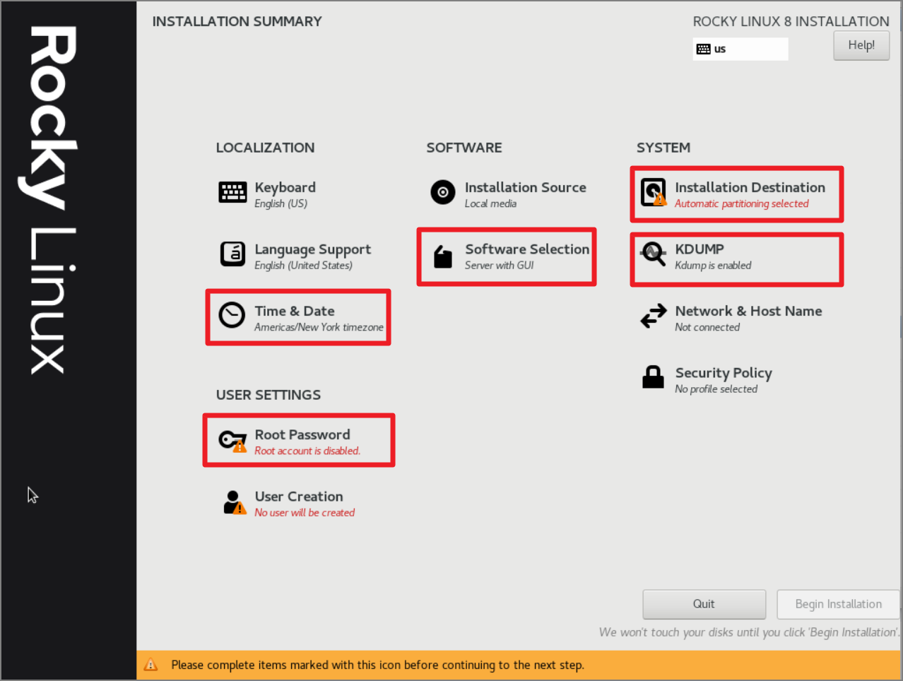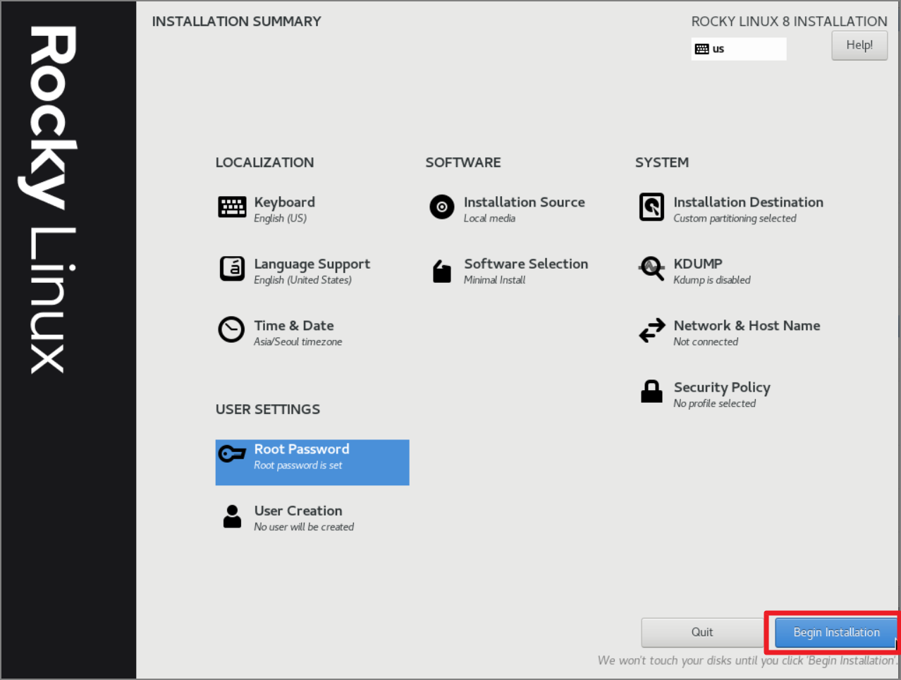 설정이 완료되면 Begin Installation 버튼을 클릭하여 설치를 진행합니다.