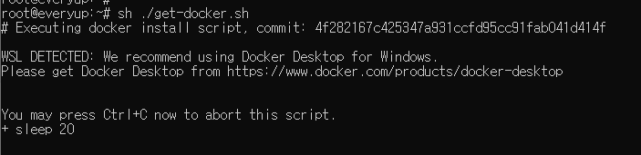 스크립트 실행 후 설치가 완료되면 docker 설치를 확인합니다.