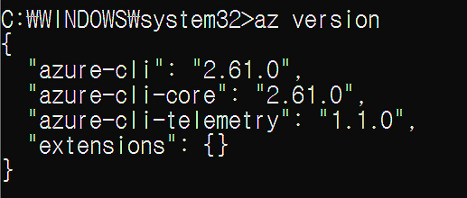설치가 완료되면 CMD나 Powershell 등에서 Azure CLI의 az 명령어를 통해 사용할 수 있습니다.az version 명령어를 통해 설치된 Azure CLI 버전을 확인할 수 있습니다.