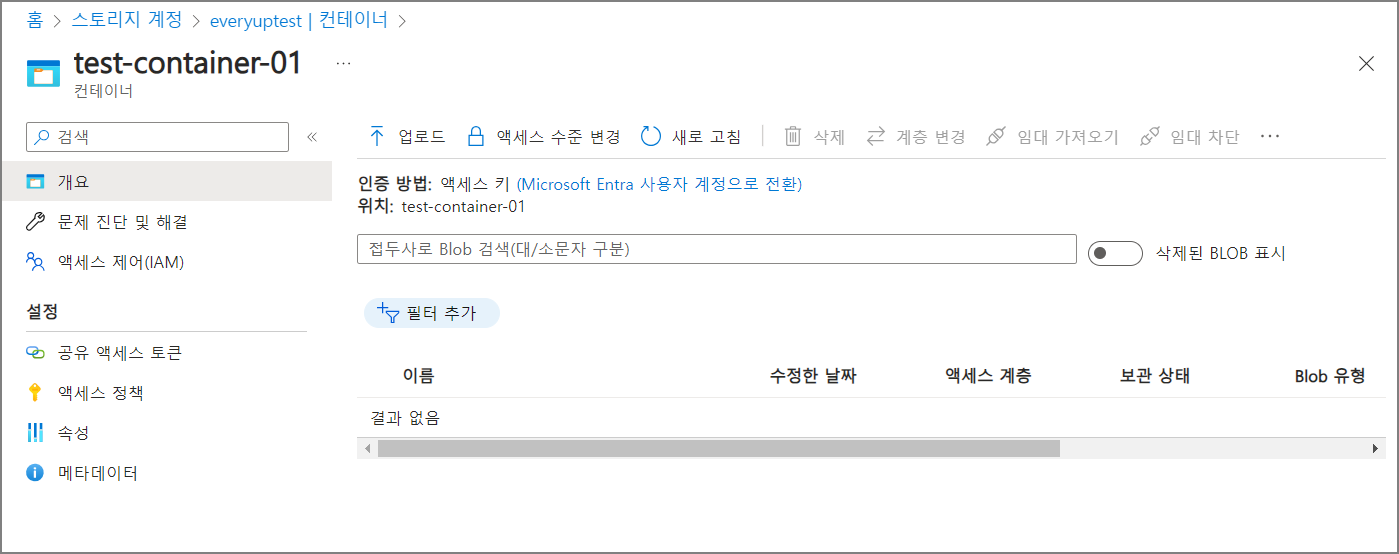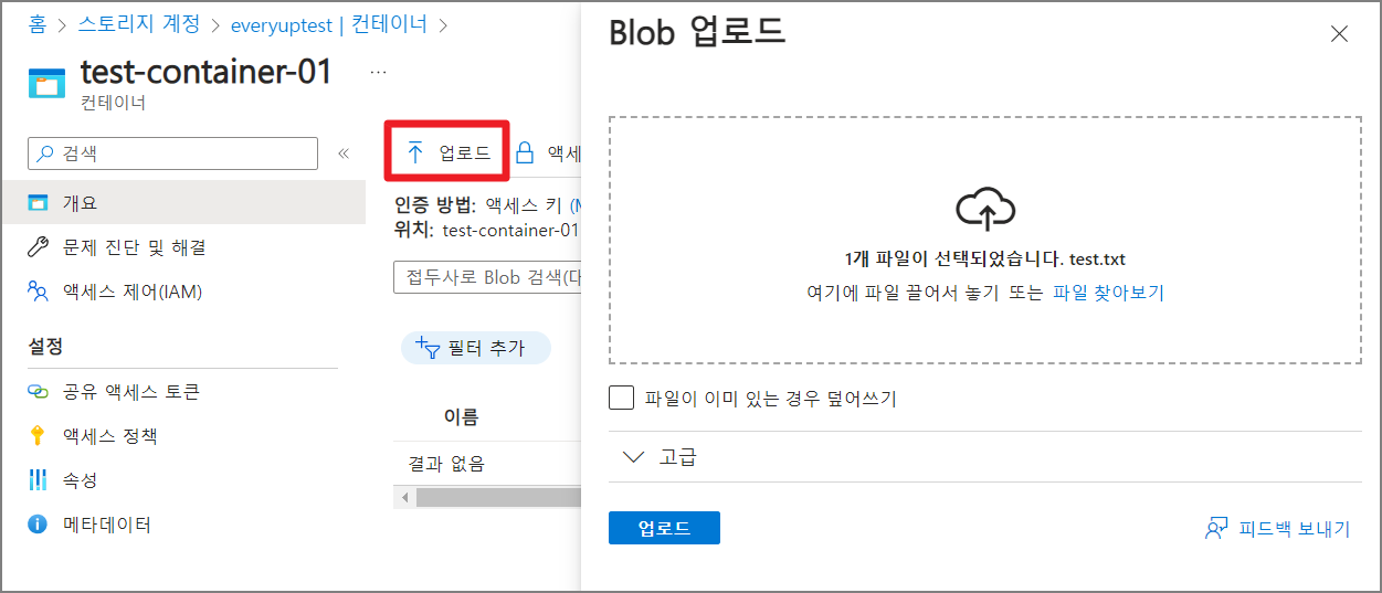 생성 완료된 컨테이너를 클릭 후 들어가보면 아래와 같이 파일을 업로드하거나 관리할 수 있습니다.