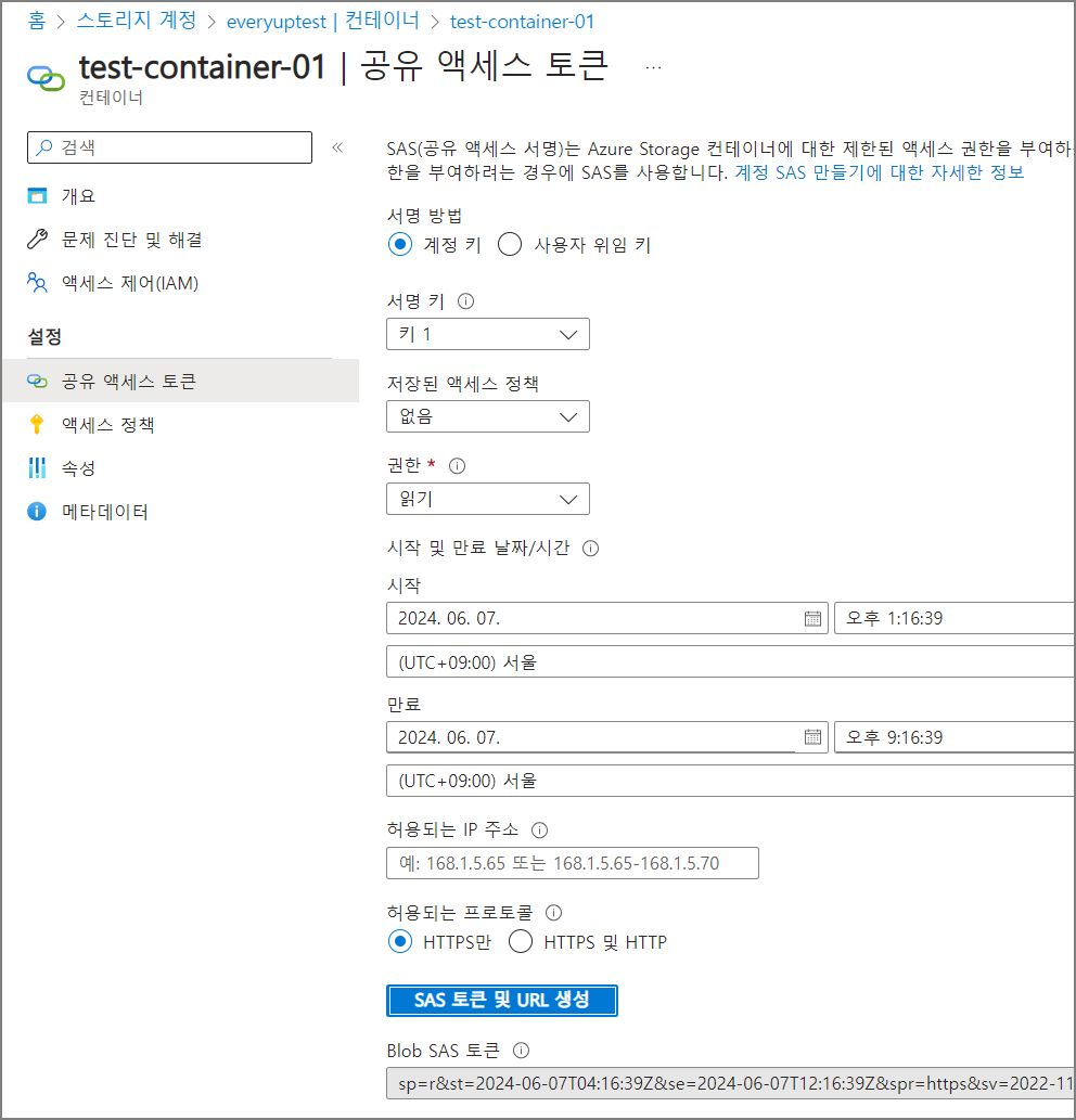 따라서 Blob 익명 액세스 옵션을 사용하거나 SAS(공유 액세스 서명) 토큰을 발급 후 URL 정보에 추가하여 다운로드 해야됩니다.