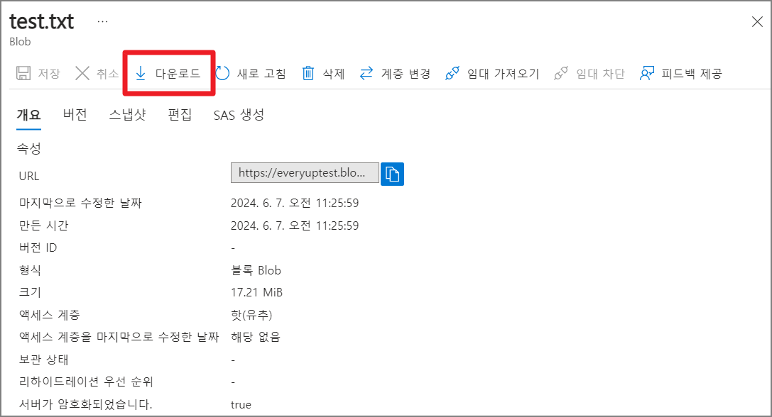 test.txt 파일을 선택하면 해당 파일에 대한 정보를 확인할 수 있으며, 다운로드 버튼을 클릭하여 파일을 다운로드 받을 수 있습니다.