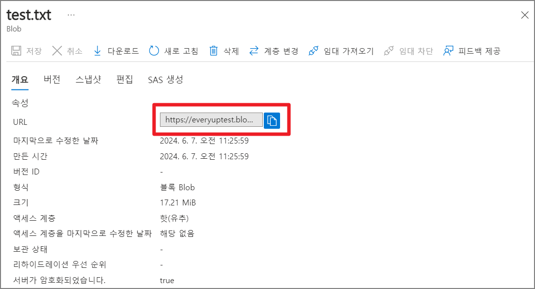 파일 선택 시 스토리지 계정 및 컨테이너 이름 정보가 포함되어 있는 URL 정보를 통해 파일 다운로드가 가능합니다.