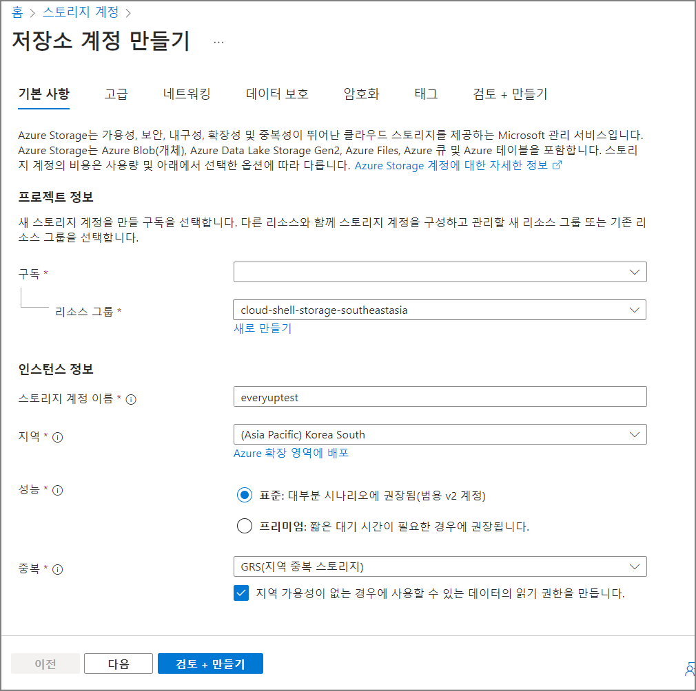 구독, 리소스 그룹, 지역 등의 옵션을 추가적으로 선택하며, 추가적인 옵션이 필요한 경우 고급, 네트워킹, 데이터 보호 등의 옵션을 추가적으로 선택 후 스토리지 계정을 생성합니다.