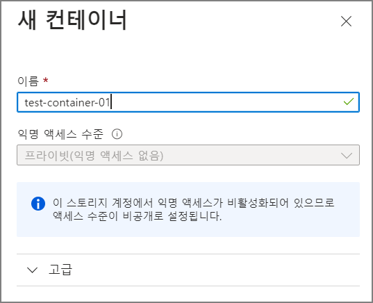 컨테이너 이름 설정 후 만들기를 통해 컨테이너를 생성합니다.