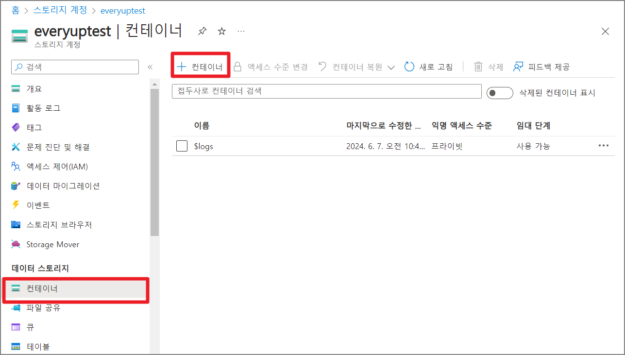 데이터 스토리지의 컨테이너 메뉴를 통해 컨테이너를 생성할 수 있습니다.