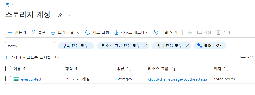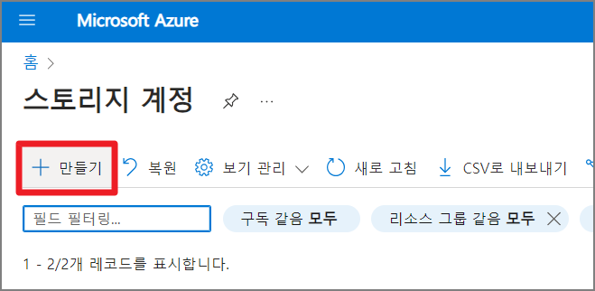 생성된 스토리지 계정은 동일한 메뉴에서 확인 가능합니다.
