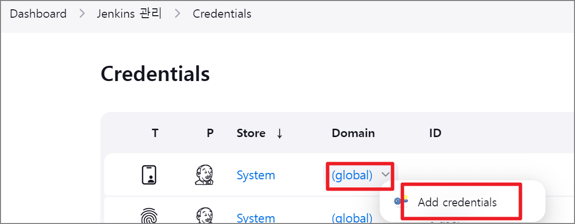 Jenkins 관리 -> Credentials 메뉴에서 global Domain 선택 후 Add credentials 을 선택합니다.