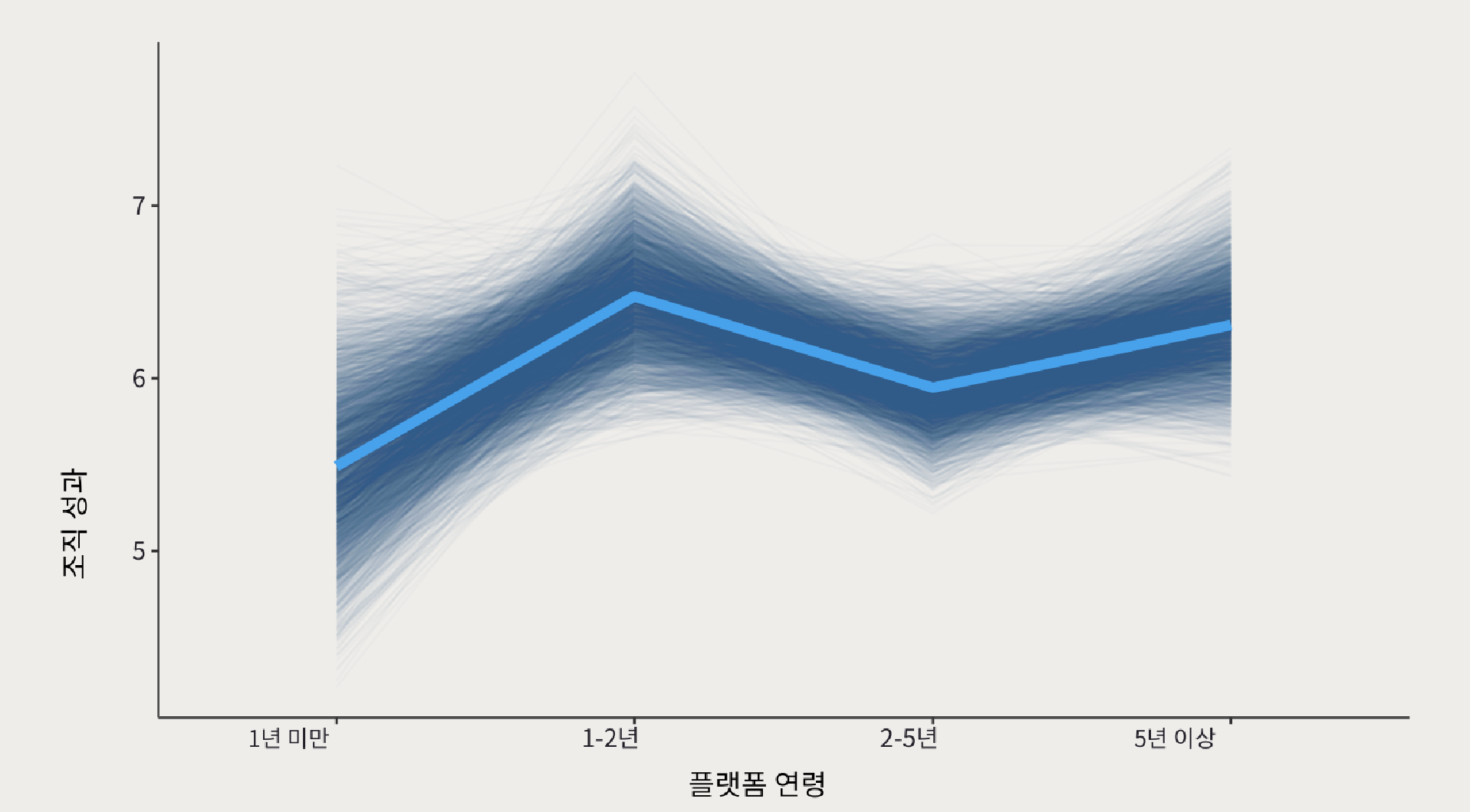 플랫폼 사용 기간(연령)에 따른 조직 성과 분석 내용입니다.