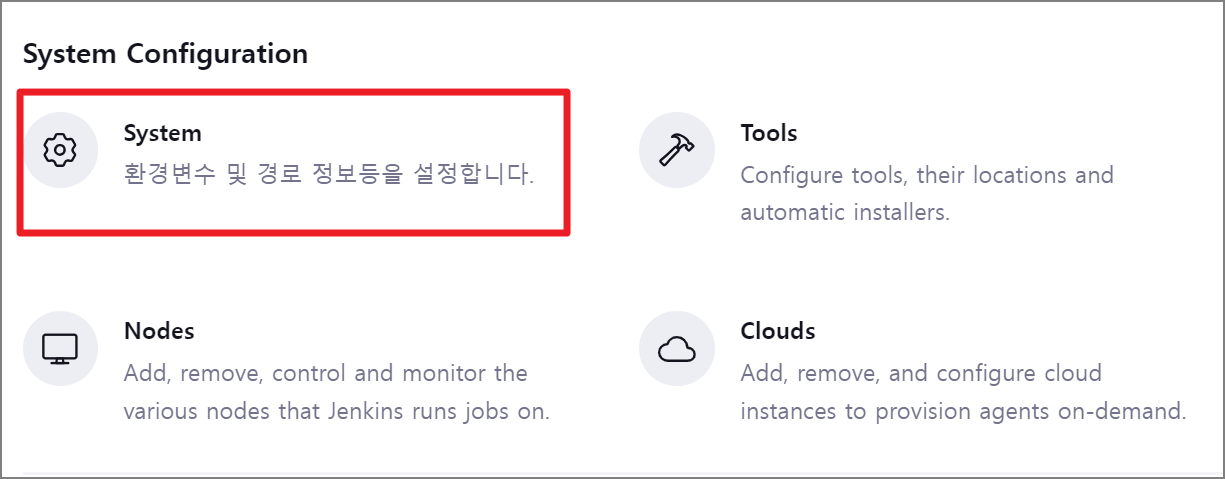 Jenkins 관리 -> System Configuration -> System 메뉴를 선택합니다.