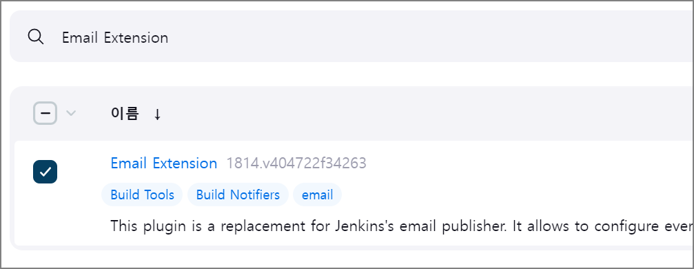 Jenkins 관리 -> Plugins -> Available plugins 메뉴에서 Email Extension 검색 후 플러그인을 설치합니다.