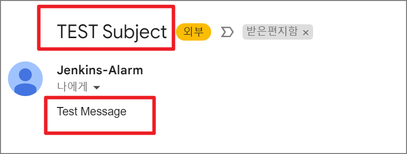 설정한 emailext 기능의 내용으로 Email 제목 및 내용이 수신되었습니다.